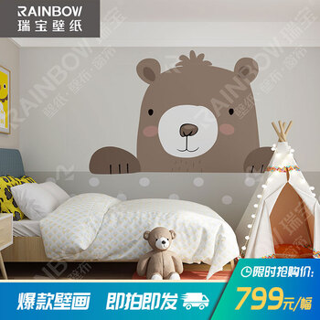 瑞宝壁纸ins风北欧风环保无纺布儿童房壁画墙纸棕熊BHZX-10116B:3.5m宽 ...